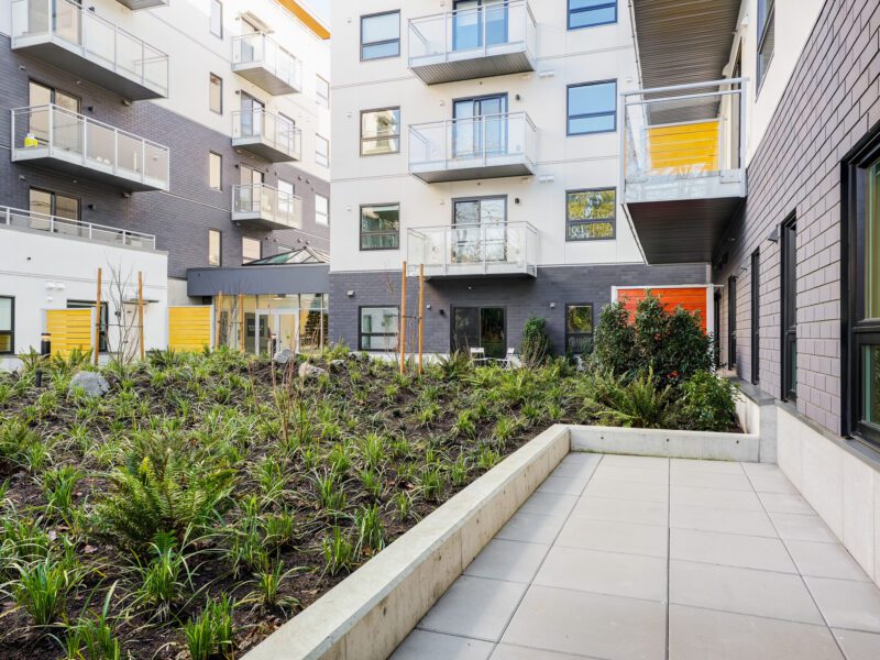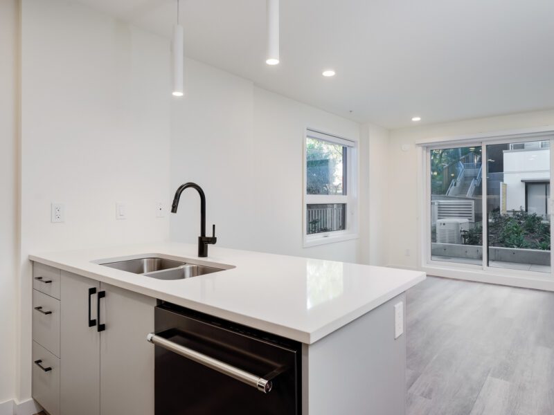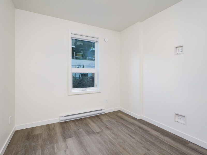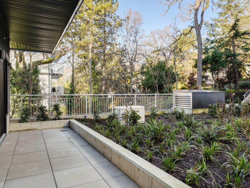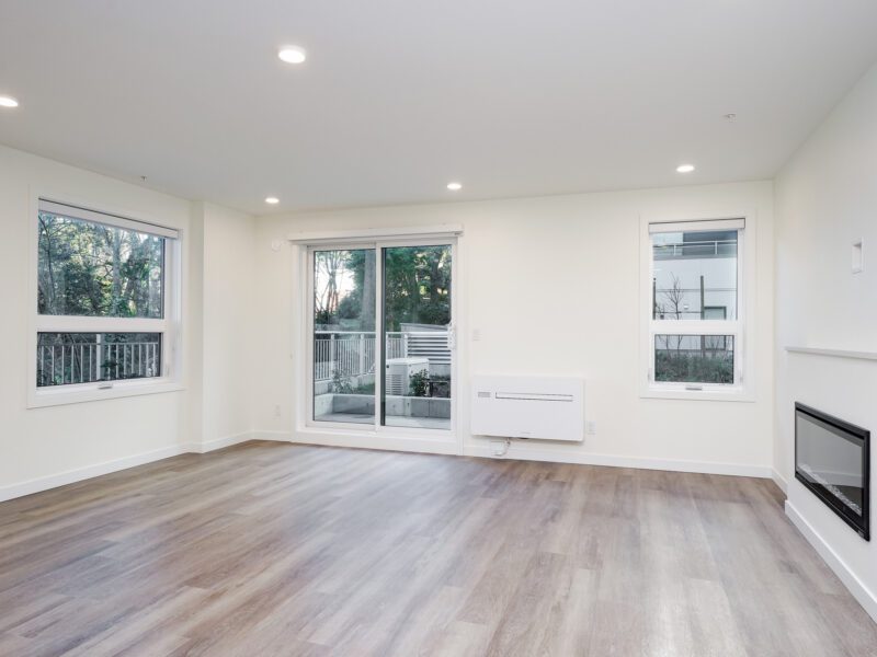 This never-lived-in, 3-bedroom, 2-full-bathroom condo is in The Proxima in Esquimalt. It features sleek black stainless-steel KitchenAid appliances in the kitchen and an inviting electric fireplace in the living room. A heat pump ensures comfort year-round, and off the living room, a patio faces the building’s green courtyard.