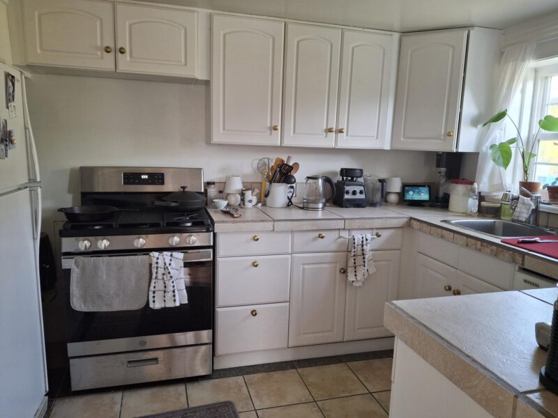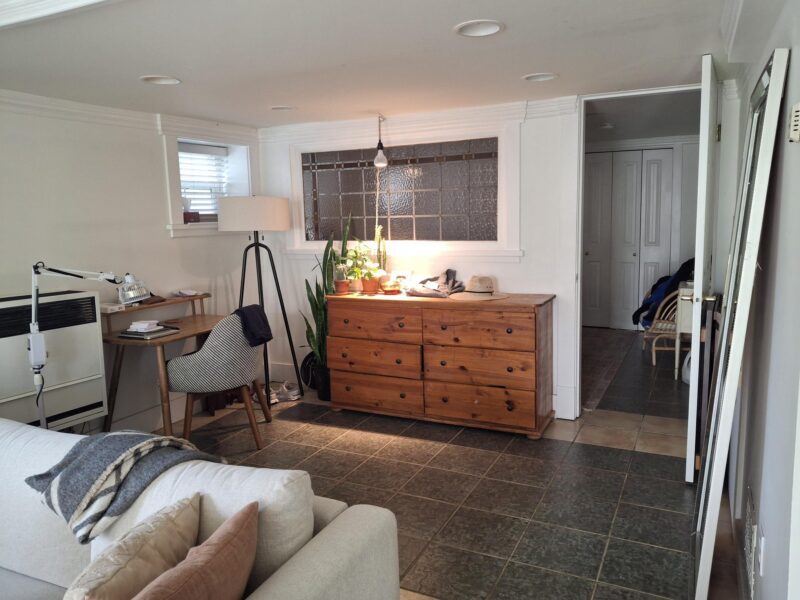 This roomy, ground-level suite has its own separate entry and a private patio and green space, accessible through the mudroom located off of the spacious living room. The large windows allow lots of natural light into the suite, perfect for plant lovers! The suite boasts charming brick finishings, ceramic tile throughout and the sizable bedroom is adorned with a stained-glass window. The well-appointed kitchen is bright, with ample cabinet space for storage, a gas range and a dishwasher.