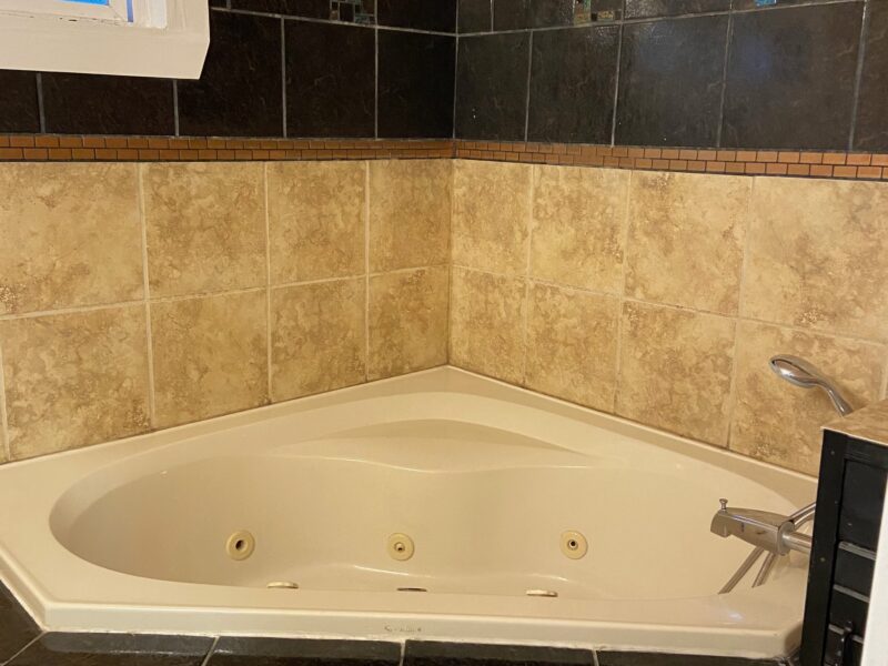 Includes a basic kitchen (fridge, microwave, induction burner) and a spacious bathroom with a large soaking tub, washer and dryer.